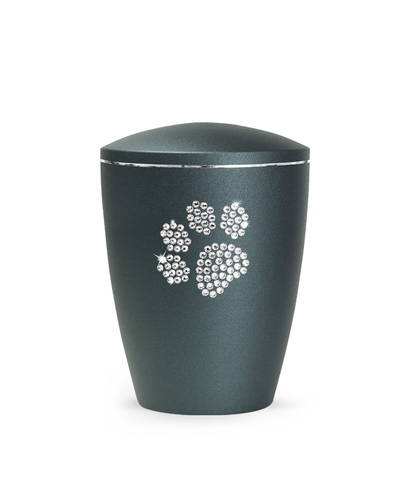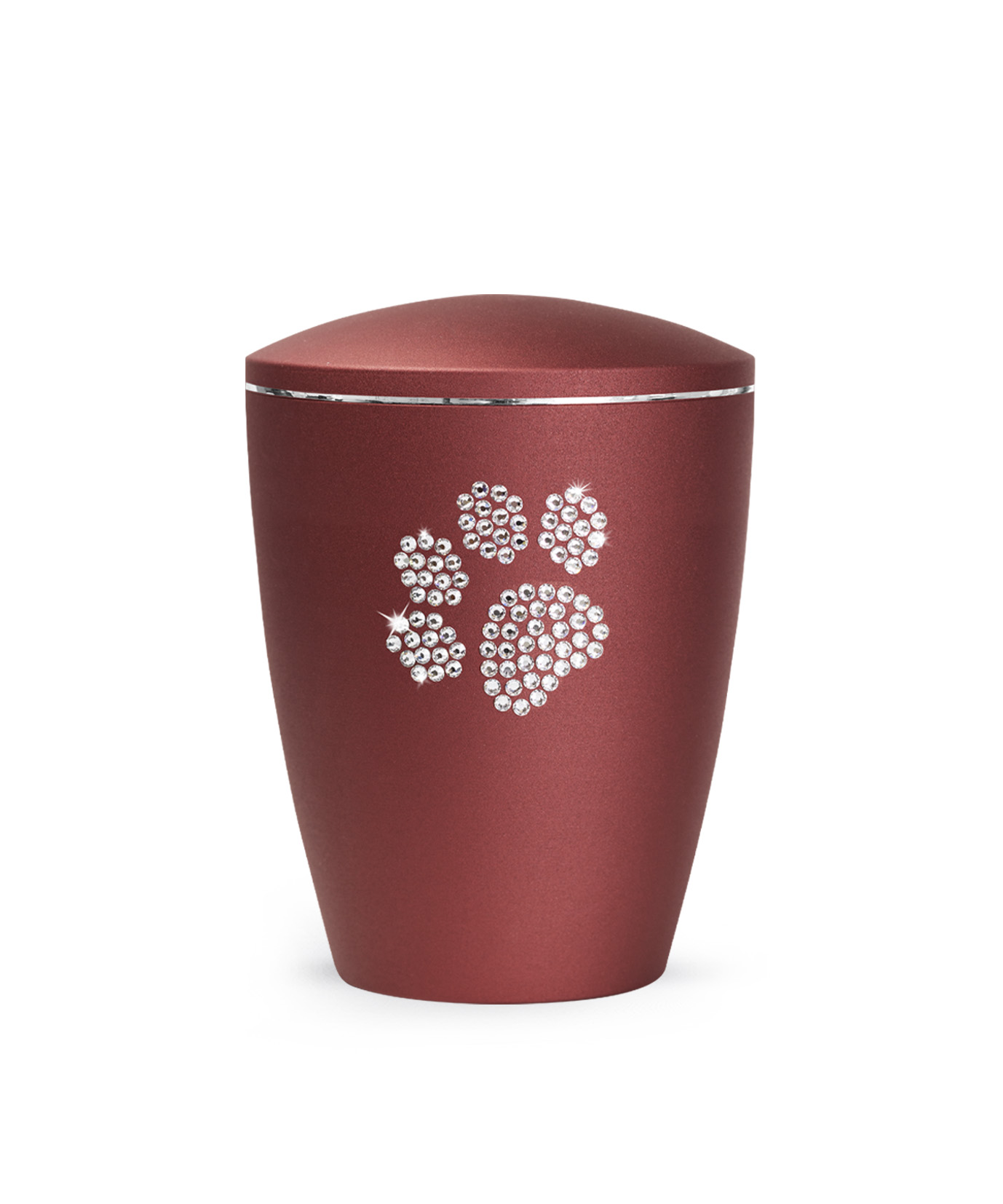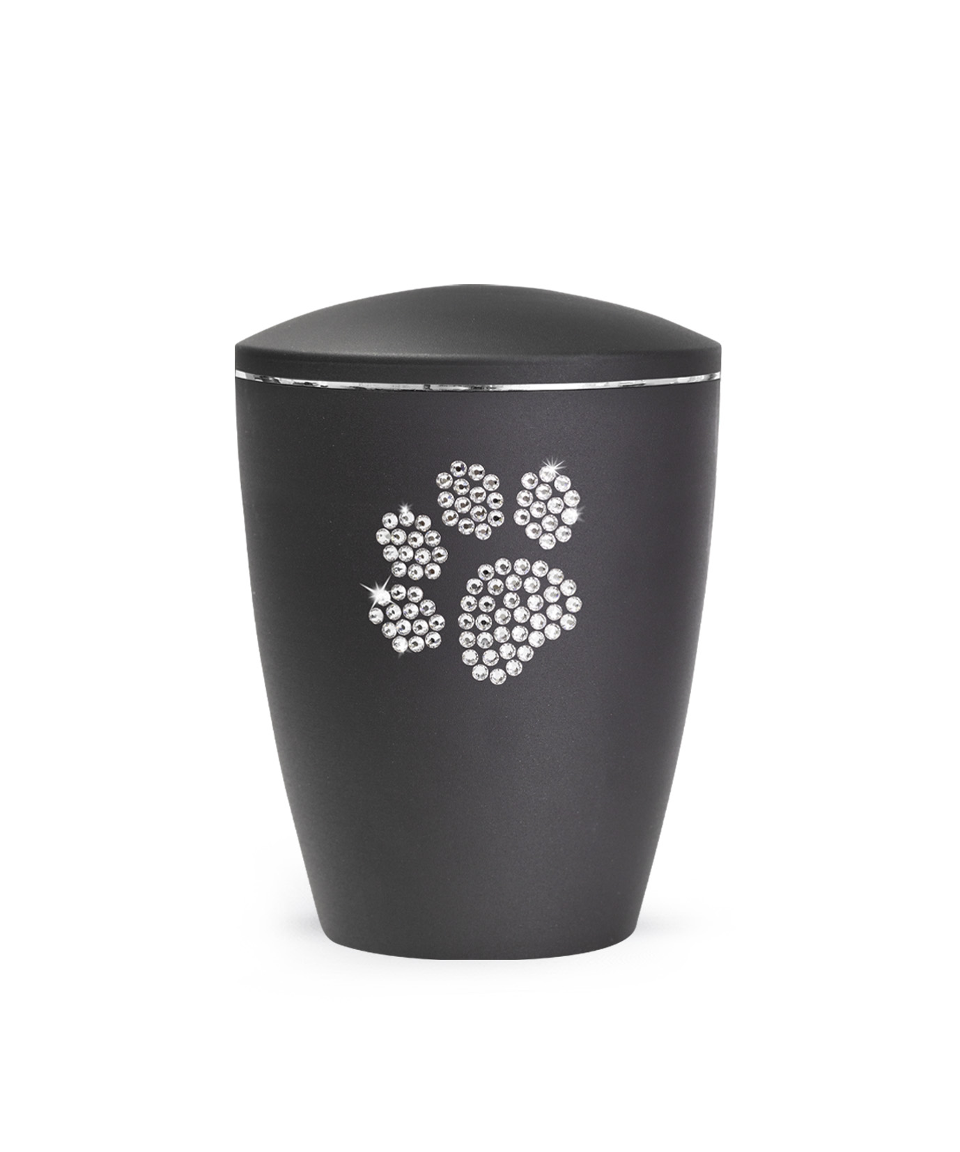 This biodegradable urn is made of durable thermoplastic material with a matt glossy surface and decorated in the shape of a paw with 100% handmade Swarovski Elements. The urn is available in the sizes 0.5 l, 1.5 l and 2.8 l and in 8 different colours. The ashes are placed inside, with or without a plastic bag (not included).