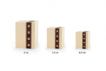 Cette urne en bois massif de haute qualité - couleur érable canadien, en forme de pavé est plaquée d´un bois véritable et décorée avec une bande de pattes. Les empreintes de pattes se trouvent sur le devant et l'arrière de l'urne.